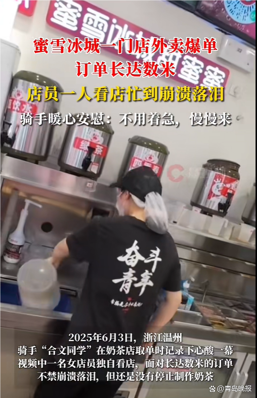 骑手安慰因订单多崩溃的女店员 暖心一幕感动网友!6月3日,在浙江温州的一家蜜雪冰城奶茶店内,一名女店员因订单过多而感到压力巨大。骑手“合文同学”在取单时记录下了这一幕。视频中,这名女店员独自看店,面对长长的订单,情绪崩溃落泪,但她依然坚持继续制作奶茶。骑手安慰她不要着急,慢慢来。据骑手透露,他在取餐时发现小姑娘已经在哭泣,且之前半小时内店里一直只有她一个人忙碌。