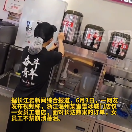 6月3日,一骑手发布视频称,浙江温州某蜜雪冰城门店仅一女员工看店,面对长达数米的订单,女员工不禁崩溃落泪,但还是没有停止制作奶茶。骑手称,在取餐的时候,小姑娘就已经哭了,他之前已经到过这个店,有半小时了,店里也一直是一个人。随后自己便离开去其他店铺取餐了,再后来返回店铺取餐已经陆续有其他员工就位上班。并称自己作为骑手不熟悉店内流程,仅能简单协助,且需赶其他订单,所以离开了。蜜雪冰城客服回应称,爆单情况已经记录下来了,稍后反馈给公司相关部门。