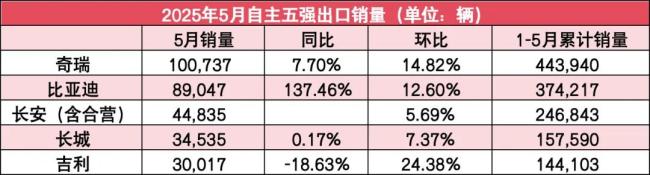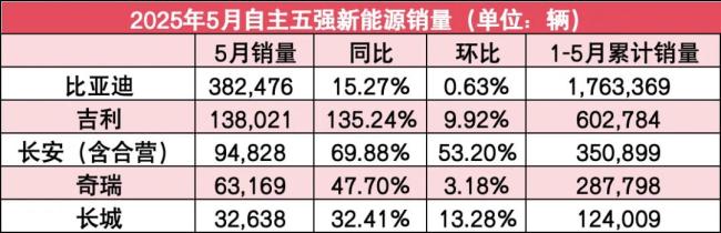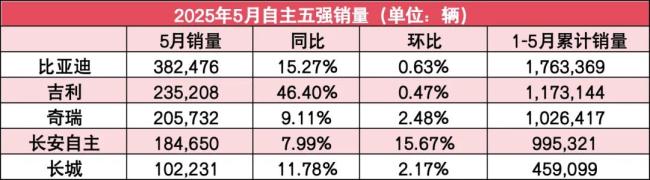 自主5强5月销量:四家环比微增!吉利坐稳第二,比亚迪海外翻番