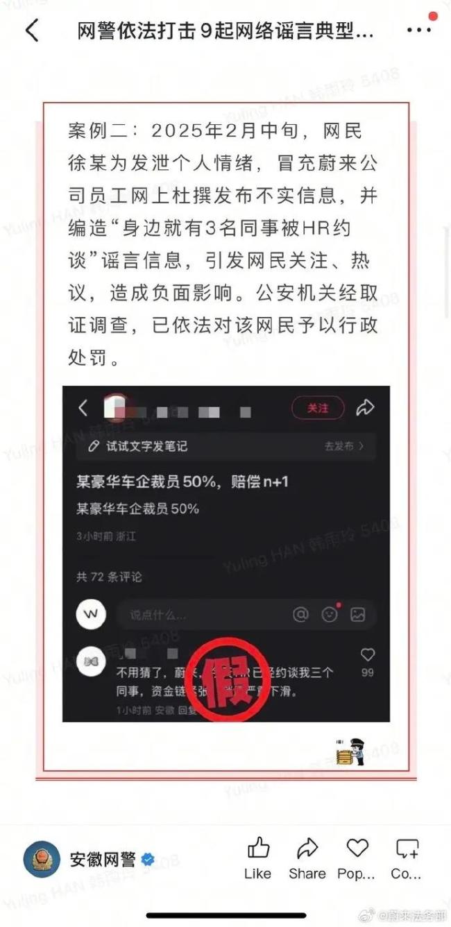 蔚来称多名造谣人员已被拘留 警方重拳打击网络谣言