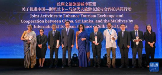 6月16日,在斯里兰卡科伦坡举行的中国-斯里兰卡-马尔代夫旅游论坛开幕式上,中国、斯里兰卡、马尔代夫代表出席《丝绸之路旅游城市联盟关于促进中国-斯里兰卡-马尔代夫旅游交流与合作的共同行动》发布仪式。新华社发(姜健摄)