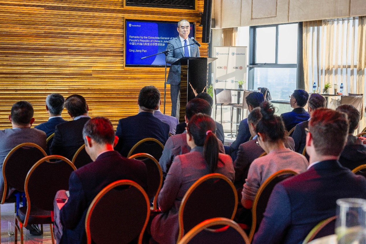 潘庆江在致辞中介绍了中南关系和经贸合作情况,鼓励中南企业加强对接合作,助力双边关系进一步发展。表示中方愿与南非在内的世界各国,不断深化互利合作,维护自由贸易和多边主义,推动建设普惠包容的经济全球化。