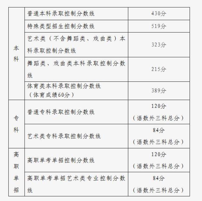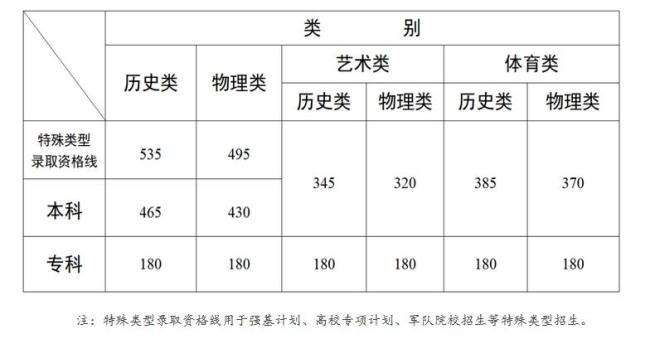 云南的特殊类型录取资格线为历史类535分,物理类495分;本科线为历史类465分,物理类430分;艺术类为历史类345分,物理类320分;体育类为历史类385分,物理类370分;专科线为180分。