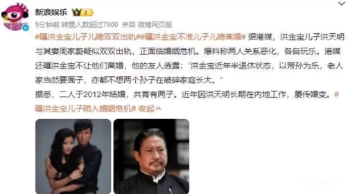 2025年6月24日,“曝洪金宝儿子儿媳双双出轨”的话题登上热搜。港媒报道称洪金宝儿子洪天明与妻子周家蔚的婚姻面临危机,两人疑似双双出轨,周家蔚被拍到与前唱片公司高层挽手前往会所,凌晨一点才离开。