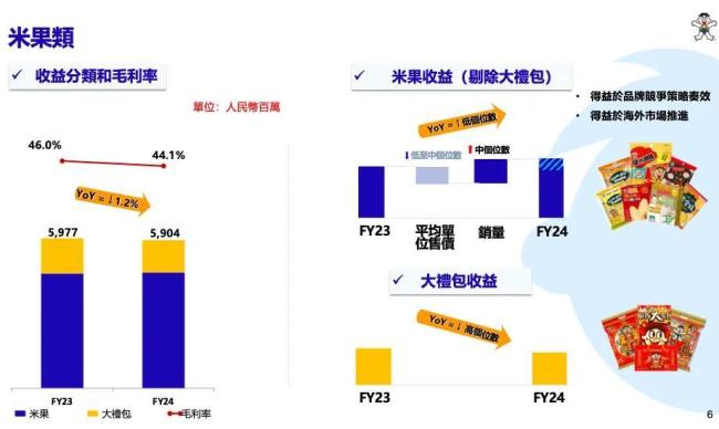2024财年,中国旺旺的米果产品(包括糖衣烧米饼、咸酥米饼及油炸小食,以及大礼包)实现收益59.04亿元,同比微降1.22%。对此,公司解释称主要是因为“受春节期间消费疲软影响收益衰退高个位数”,但米果类剔除礼包后的收益同比上升低个位数,其销量同比上升中个位数。