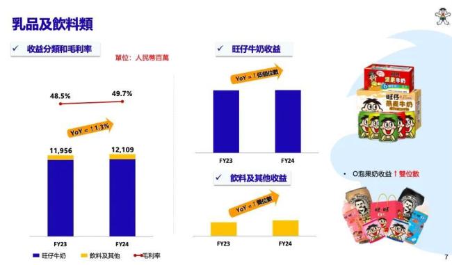 2024财年,中国旺旺的乳品及饮料类毛利率49.7%,较去年同期上升1.2个百分点。主系:进口奶粉、原纸、铁皮包装材料单位耗用成本同比下降高个位数影响。