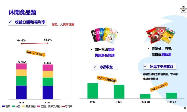 2024财年,休闲食品类毛利率44.5%,较去年同期上升0.5个百分点。