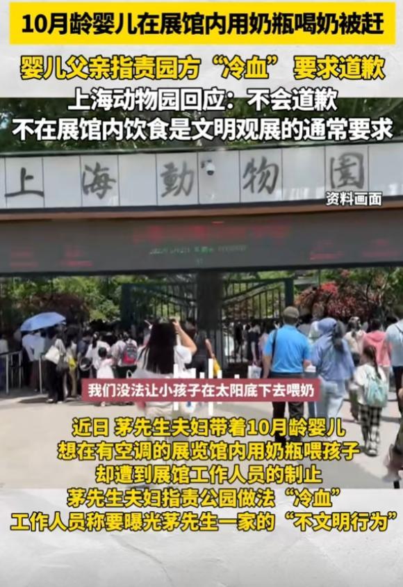 6月14日,在上海动物园发生了一起事件。茅先生夫妇带着10个月大的孩子去动物园游玩,中午时分孩子饿了,他们没有找到附近的母婴室,便在展览馆靠近门口的位置给孩子喂泡好的牛奶。然而,工作人员以“展馆内禁止饮食”为由驱赶了他们。茅先生夫妇感到不满,因为他们看到其他人在喝水却未受阻拦,并且要求工作人员出示相关规章通告,但未能得到满足。随后,他们向上海动物园投诉,希望获得道歉。