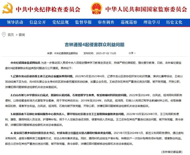 7月2日,中央纪委国家监委网站通报了吉林省4起侵害群众利益的典型问题。其中一起涉及白山市第七中学原校长白凤武、原副校长祖鸿雨和石艳。他们在2022年至2024年间通过降低餐食标准套取学生餐费,用于学校其他支出;在2019年至2024年间,三人利用订购学生教辅材料的机会收取销售商回扣款,严重侵害了学生利益。白凤武、祖鸿雨和石艳均被开除党籍、开除公职,并因涉嫌犯罪被移送检察机关依法审查起诉。