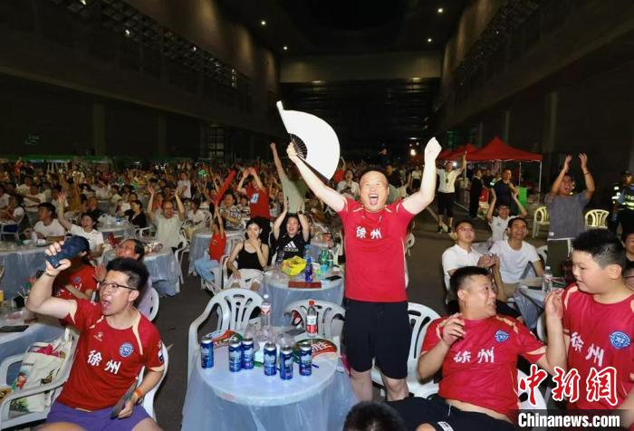 中新网徐州7月7日电 (朱志庚 唐娟)7月5日晚,“苏超”徐州队主场坐镇徐州奥体中心体育场,与南通队展开激战。“苏超”场内3万余名球迷与场外第二现场球迷随着赛程一起“沸腾”。就在徐州主赛场一路之隔的徐州淮海国际博览中心,数千名市民齐聚“一起看球8‘苏超’云龙大集暨巨幕观赛之夜”活动,就着扎啤现场观看直播,为“苏超”呐喊助威,着实开启一场夏夜足球狂欢。