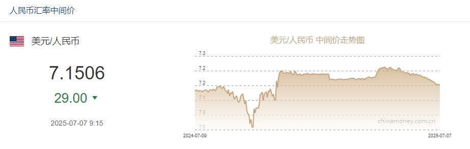 7月7日人民币对美元中间价报7.1506 上调29个基点