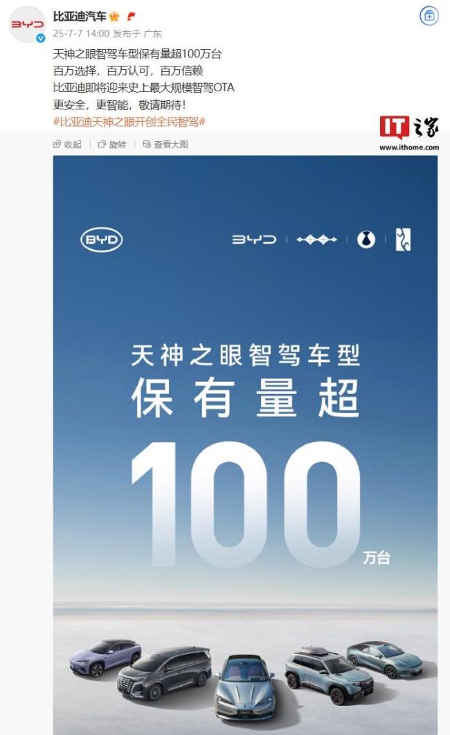 比亚迪将迎最大规模智驾OTA 天神之眼保有量超百万。比亚迪汽车官方宣布,天神之眼智驾车型保有量已超过100万台。公司即将迎来史上最大规模的智驾OTA升级,但具体更新内容尚未公布。