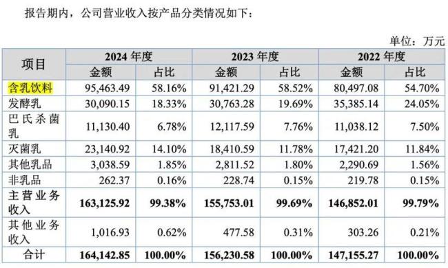 目前,酸乐奶仍是菊乐股份的“当家花旦”。据招股书披露,2024年,菊乐营收达16.41亿元;其中,酸乐奶所在的“含乳饮料”业务营收为9.55亿元,贡献了过半营收。