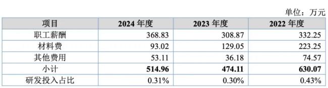 2022-2024年,菊乐股份研发费用分别为 630 万、474.1 万和 514.9 万,占营收比重仅 0.42%、0.30% 、 0.31%,处于较低水平。