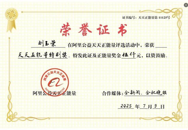 阿里公益天天正能量对刘玉荣的善举给予了高度肯定。7月9日,他们决定联合合新闻为刘玉荣颁发正能量特别奖,并奖励5000元。工作人员表示,刘玉荣用勇气点亮生命的微光,让善良在浪尖闪耀。