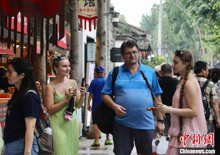 7月15日,四川成都,外国游客在宽巷子驻足游览。时下正值暑期旅游旺季,成都市宽窄巷子景区迎来众多游客前来游玩、打卡。中新社记者 王磊 摄