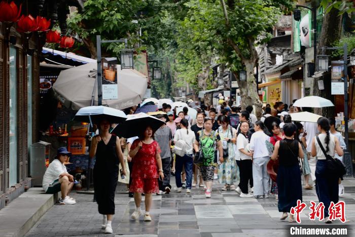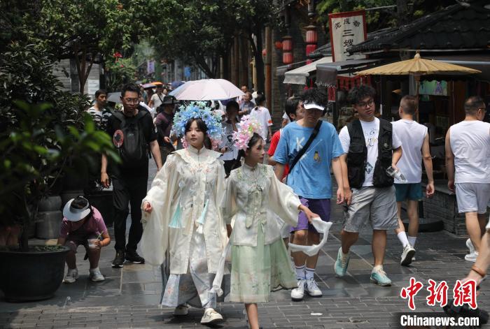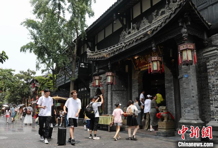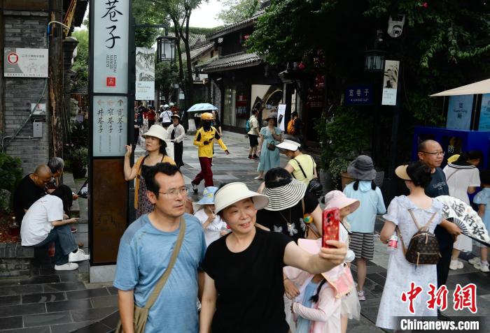 7月15日,四川成都,游人在宽巷子游览。时下正值暑期旅游旺季,成都市宽窄巷子景区迎来众多游客前来游玩、打卡。中新社记者 王磊 摄