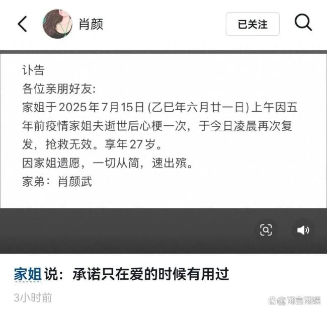 讣告由肖颜的弟弟发出,透露了一个令人痛心的过往:五年前,肖颜的丈夫去世时,她曾出现过一次心梗。这一次,命运没有再眷顾她。22岁丧夫,27岁自己也永远地离开了这个世界,这样的人生遭遇实在太过悲惨。