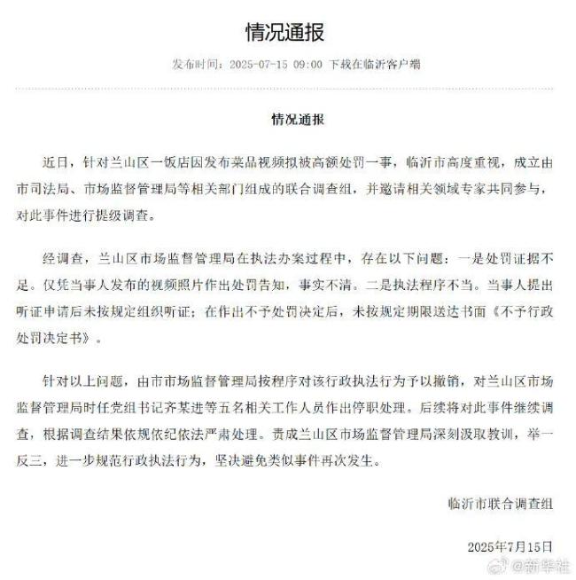 针对这些问题,市市场监督管理局撤销了该行政执法行为,对兰山区市场监督管理局时任党组书记齐某进等五名相关工作人员作出停职处理。后续将继续调查,根据结果依规依纪依法严肃处理。同时,责成兰山区市场监督管理局深刻汲取教训,进一步规范行政执法行为,坚决避免类似事件再次发生。