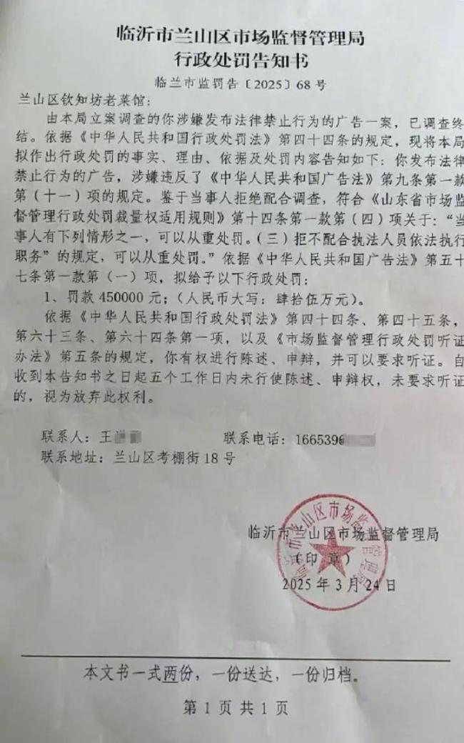 此前,张女士在临沂市兰山区经营一家名为钦知坊的老菜馆。今年2月,她在短视频平台上发布了一段自己拍摄的菜品视频。3月22日,她接到兰山区市监局电话,称其发布的视频涉嫌为违法广告,要求配合调查。由于当时张女士在几十公里外的娘家,便表示会在一周内去接受调查,并删除了视频。