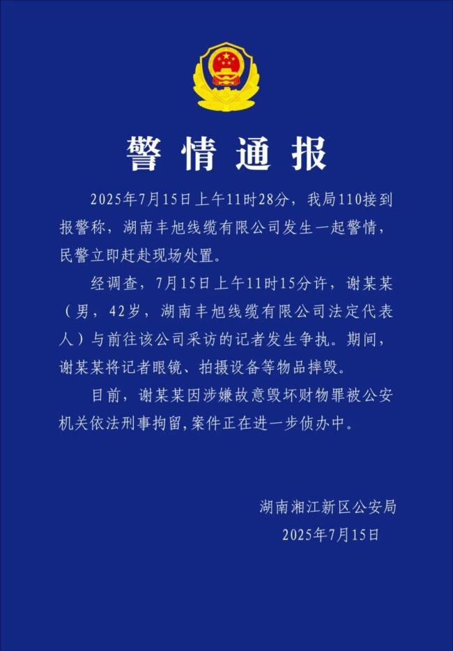经调查,当天上午11时15分左右,该公司法定代表人谢某某(男,42岁)与前往采访的记者发生争执。争执过程中,谢某某摔毁了记者的眼镜和拍摄设备。目前,谢某某因涉嫌故意毁坏财物罪被公安机关依法刑事拘留,案件正在进一步侦办中。