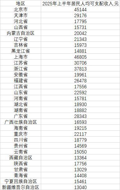 国家统计局网站公布了31个省份2025年上半年居民人均可支配收入情况。数据显示,今年上半年有11个省份居民人均可支配收入超过2万元,其中上海和北京超过了4.5万元。