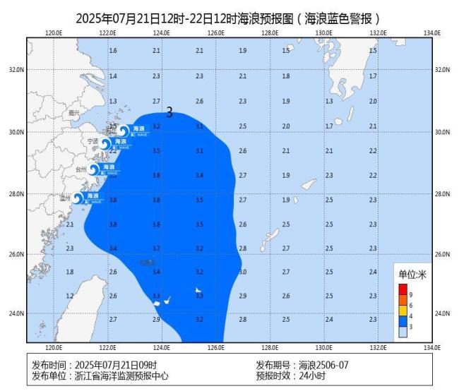 今天上午,浙江省海洋监测预报中心根据《海洋灾害应急预案》发布最新一轮的海浪蓝色警报。受今年第6号台风“韦帕”(热带风暴级)外围影响,预计今天中午到明天中午:
