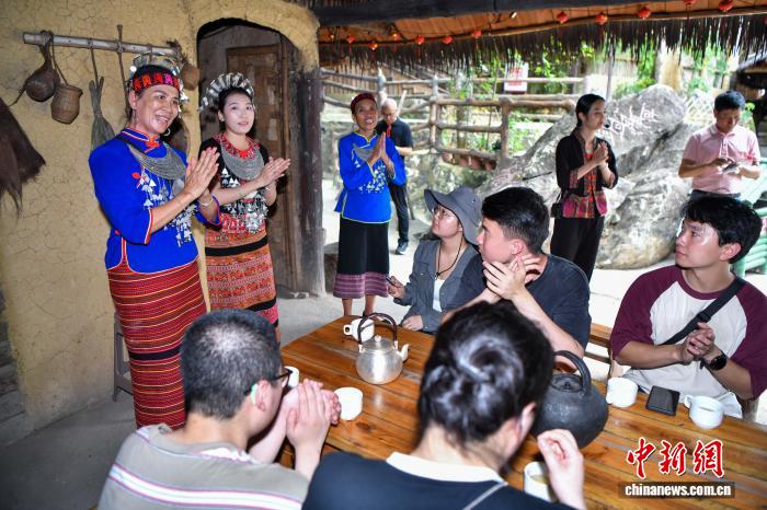 7月19日,在保亭黎族苗族自治县的海南槟榔谷黎苗文化旅游区,黎族妇女演唱传统民族歌曲欢迎游客。中新社记者 骆云飞 摄