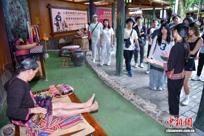 7月19日,在保亭黎族苗族自治县的海南槟榔谷黎苗文化旅游区,黎族阿婆展示黎族传统纺染织绣技艺吸引游客观看。中新社记者 骆云飞 摄