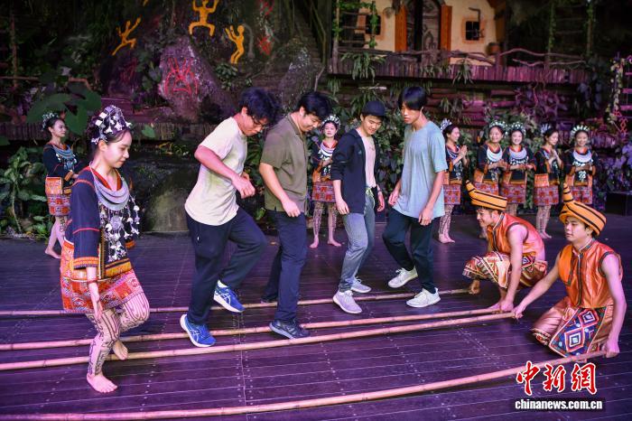 7月19日,在保亭黎族苗族自治县的海南槟榔谷黎苗文化旅游区,游客体验竹竿舞。中新社记者 骆云飞 摄
