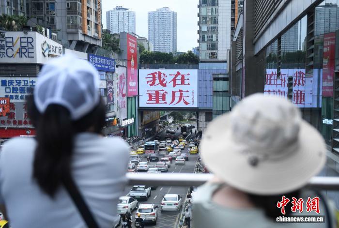 7月20日,19个国家和中国港澳台地区的26家华文媒体走进重庆江北观音桥商圈参观。重庆观音桥商圈的一座天桥因“我在重庆”巨型广告屏而走红,成为网红打卡地。图为嘉宾参观“我在重庆”巨型广告屏。中新社记者 周毅 摄