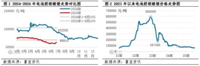 数据显示,自2022年末碳酸锂价格自60万元/吨高点下跌以来,两年的时间依然未能触底,今年以来依然延续震荡下跌趋势。据卓创资讯数据,今年1-6月,国内电池级碳酸锂均价在69910元/吨,较上年同期下跌32.36%,较2024下半年均价环比下跌9.44%。期间,最高价出现在1月下旬,在77000元/吨附近,最低点则在5月底,一度跌破6万元,刷低至59600元/吨。截至6月30日,电碳收于62300元/吨,较年初下跌18.03%。