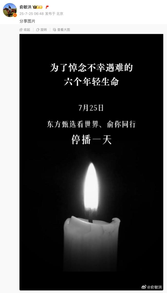 7月25日早间,东方甄选董事会主席俞敏洪在微博发文表示,为了悼念不幸遇难的六个年轻生命,当天东方甄选看世界、俞你同行停播一天。