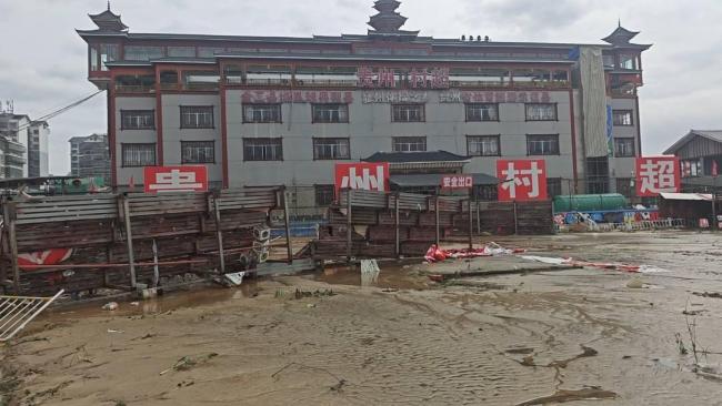 6月24日,洪水侵袭榕江,“村超”主场地沦为重灾区。8000平方米的草坪被淤泥覆盖,塑胶跑道被全部掀起,球场所在街道的商铺全都被浸泡在洪水中。洪水退去后,球场的重建工作逐步推进。200多名工人分为10多个施工小组,分别负责跑道、草皮、看台及电子转播等项目的修复工作,最终按1:1比例还原“村超”球场。