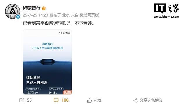 鸿蒙智行微博发文称,已看到某平台所谓“测试”,不予置评。