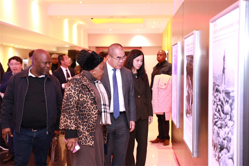 图为与会嘉宾共同参观中国人民抗日战争暨世界反法西斯战争胜利80周年图片展。中国驻约翰内斯堡总领馆供图