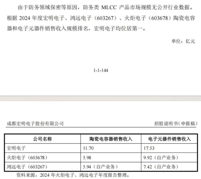 据宏明电子招股书,由于防务领域保密等原因,防务类MLCC产品市场规模无公开行业数据。如果根据2024年度陶瓷电容器和电子元器件销售收入规模排名,宏明电子排第一。