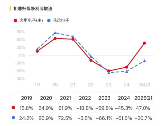 火炬电子、鸿远电子预计2025H1扣非净利润下限分别为2.4亿、1.6亿,同比增长下限分别为51.3%、40.1%。在此之前,两家业绩均连续下滑三年。