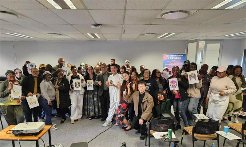 随后进行的中国京剧脸谱绘画制作体验将现场气氛推向了高潮。志愿者教师冯泽魁用京剧脸谱解读中国颜色符号,关羽之红、典韦之黄、窦尔敦之蓝,与南非国旗色块遥相呼应。在冯泽魁、杨煜两位老师的带领下,学员们提笔上色,十余分钟后,一张张“中南融合脸”诞生。“这简直太有趣了!中国戏曲中的颜色居然这么富有意义!今天的开班仪式内容丰富精彩、有趣且令人激动愉悦。我和我的同事们都迫不及待想要学习中文!”莫迪莎(Mandisa)说道,今天她为了参加此次活动还特意穿戴了富有中国文化气息的服饰。“我要把它挂在办公室,提醒自己下周五的中文课绝不能缺席。”学员乔巧(Jojo)手持刚完成的“彩虹关羽”兴奋地说。