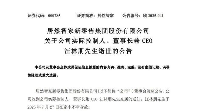 7月27日,汪林朋在家中坠亡。消息最初以“传闻”形式流出,称其在当天上午于北京家中坠楼,一度让人难以置信。直到次日晚间,居然智家才发布正式公告确认:董事长汪林朋于7月27日在家中不幸身故。