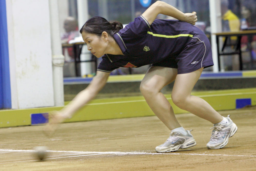 ↑2006年10月21日,中国地掷球运动员岑伟飞在温州举行的第五届世界女子金属地掷球世界锦标赛单打决赛中。她12比5战胜法国选手获得冠军。这是中国运动员首次在地掷球世锦赛上夺得此项目冠军。