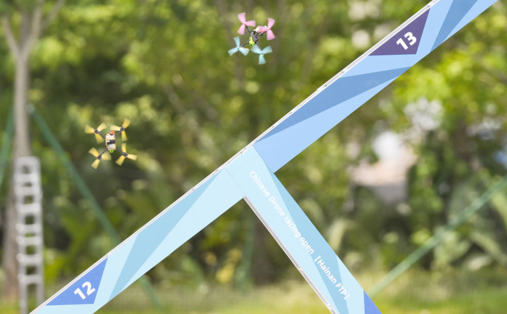 ↑2023年7月15日,参赛选手操作的无人机在2023年中国无人机竞速公开赛(海南自贸港站)比赛中。