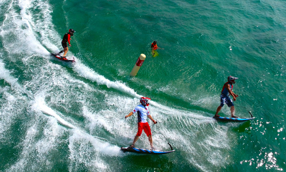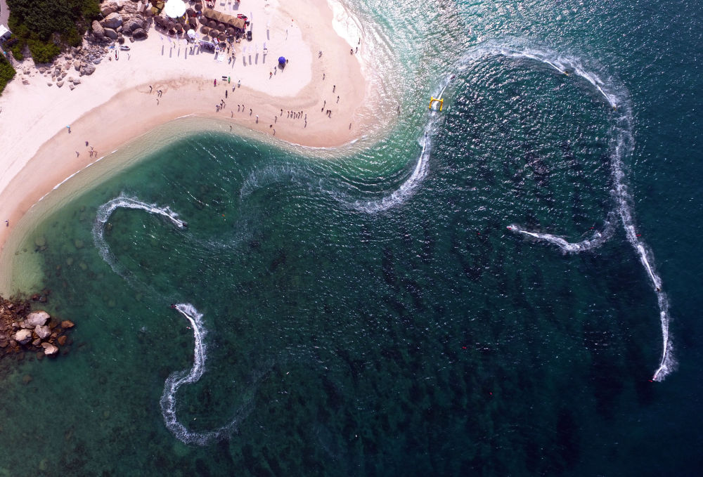 ↑2016年9月18日,参赛选手在三亚蜈支洲岛举行的2016动力冲浪板国际赛中国站比赛中。