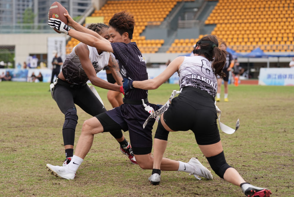 ↑2025年5月25日,北京体育大学队球员吴婷(中)在2025宁波腰旗橄榄球公开赛中进攻。