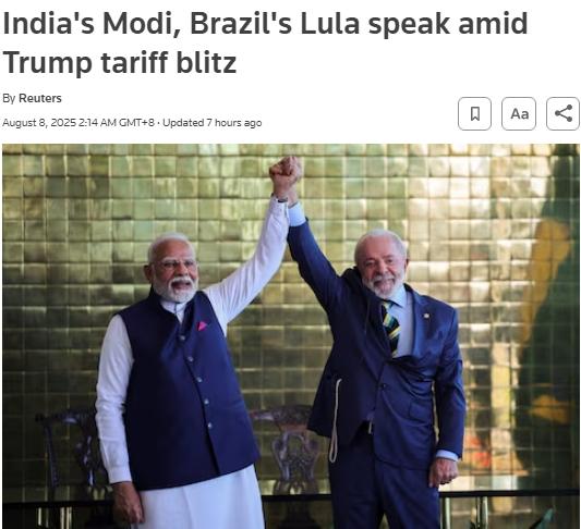 报道称,巴西总统办公室表示,“两国领导人讨论了国际经济形势及单方面征收关税的问题。截至目前,巴西和印度是受影响最严重的两个国家。”