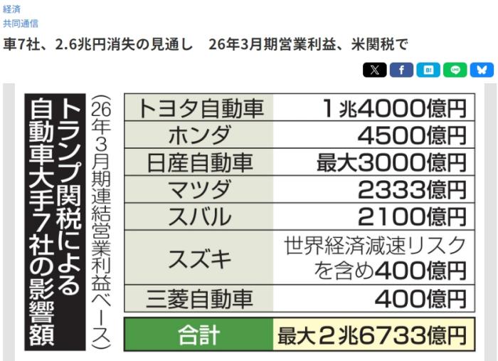 受美国关税影响 日本七大车企利润或将缩水2.6万亿日元