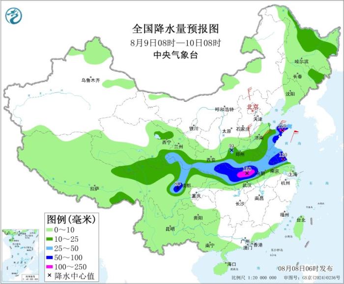 8月8日08时至9日08时,内蒙古东部、黑龙江西部、华北大部、黄淮大部、江淮东部、江汉西部、西北地区东南部、四川盆地北部和西部、青海南部、重庆东北部等地部分地区有中到大雨,其中,河北中南部、北京南部、天津南部、山东北部、河南北部和西部、安徽东北部、甘肃南部等地部分地区有暴雨或大暴雨(100~180毫米)。内蒙古中东部、陕西北部、河北中北部等地部分地区有4~5级风。