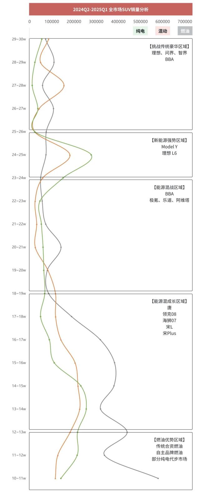 作为乐道的首款产品,L60 的成绩并不差,只不过它处在一个尴尬的市场空间内,20 万级别的 SUV 上面有一座大山,那就是 Model Y,整个市场呈现出了一个虹吸效应,如果探究 L60 面临的真正挑战,那就是它进入了一个无法快速打开局面的细分市场。对比同级别的极氪 7X,2024 年 10 月和 11 月,7X 销量连续破万,而 L60 也在 12 月破万。进入到 2025 年,经历了春节的波动,在第二季度二者的销量也基本稳定在每月 5000 上下。