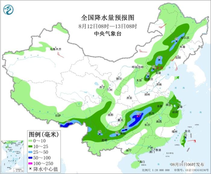 图3 全国降水量预报图(8月11日08时-12日08时) 图片来源:中央气象台网站