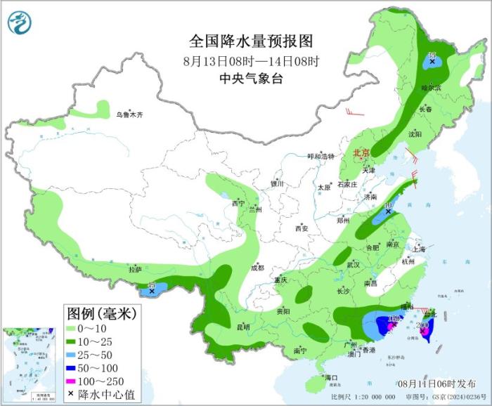 图5 全国降水量预报图(8月13日08时-14日08时) 图片来源:中央气象台网站